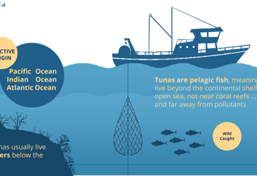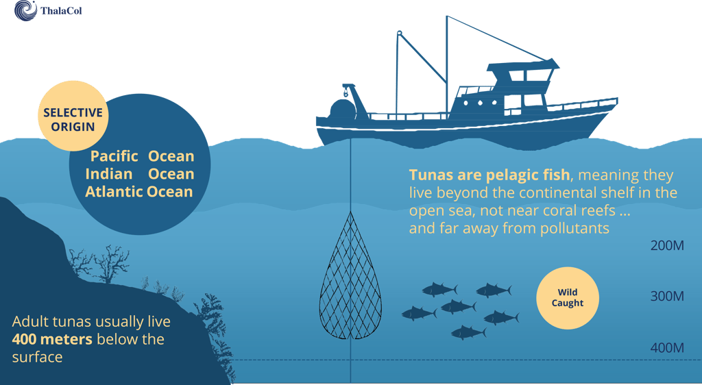 Tunas are pelagic fish, meaning they live beyond the continental shelf in the open sea, not near coral reefs …and far away from pollutants